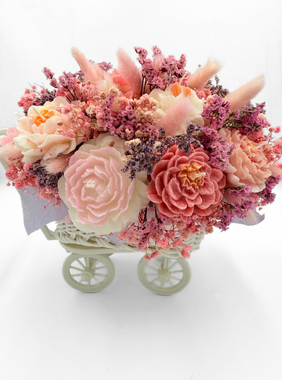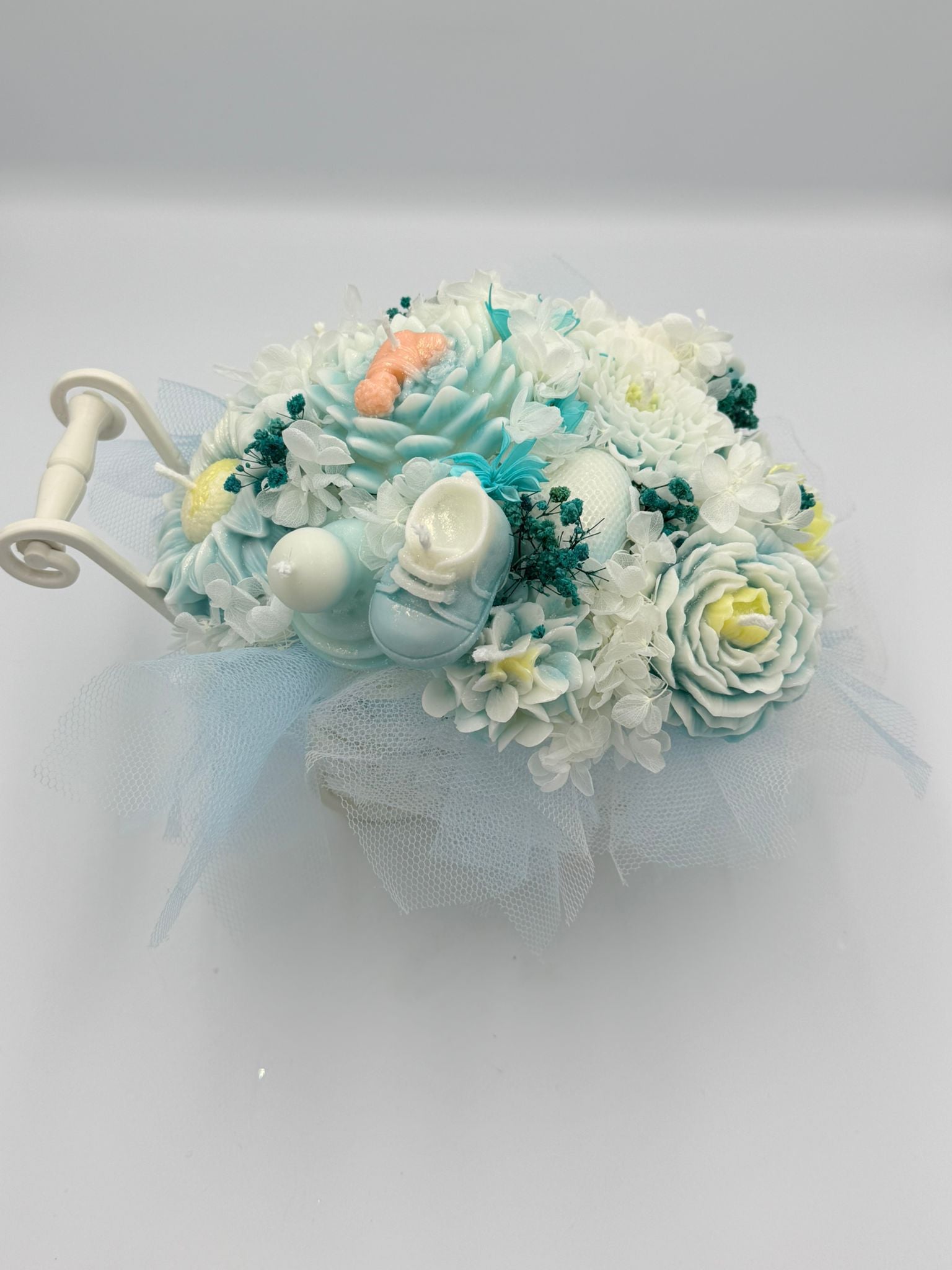 Een bos bloemen met heerlijke geuren, prachtige kleuren in een kinderwagen, zowel in meisjes - en jongens achtige tinten verkrijgbaar.