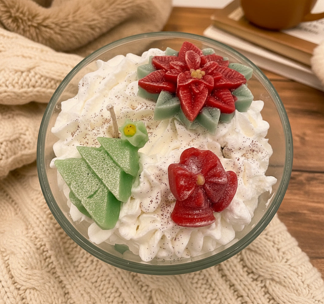 Breng instant kerstsfeer in huis met X-Mass Green, een handgemaakte winterkaars die eruitziet als een feestelijke kersttraktatie. Deze unieke bowl-kaars combineert een frisse groene basis met een royale laag “whipped cream” wax, rijk en romig van textuur. De kaars is afgewerkt met gedetailleerde 3D kerstfiguren – een groene kerstboom en rode winterbloemen en belletjes – en subtiel glitterpoeder voor een magische, fonkelende finish.