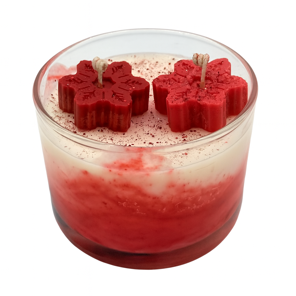 De handgegoten was in diepe rode en romige tinten, afgewerkt met twee sneeuwvloklonten, brengt direct een vleugje kerstmagie in huis.