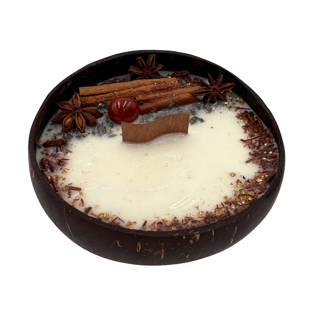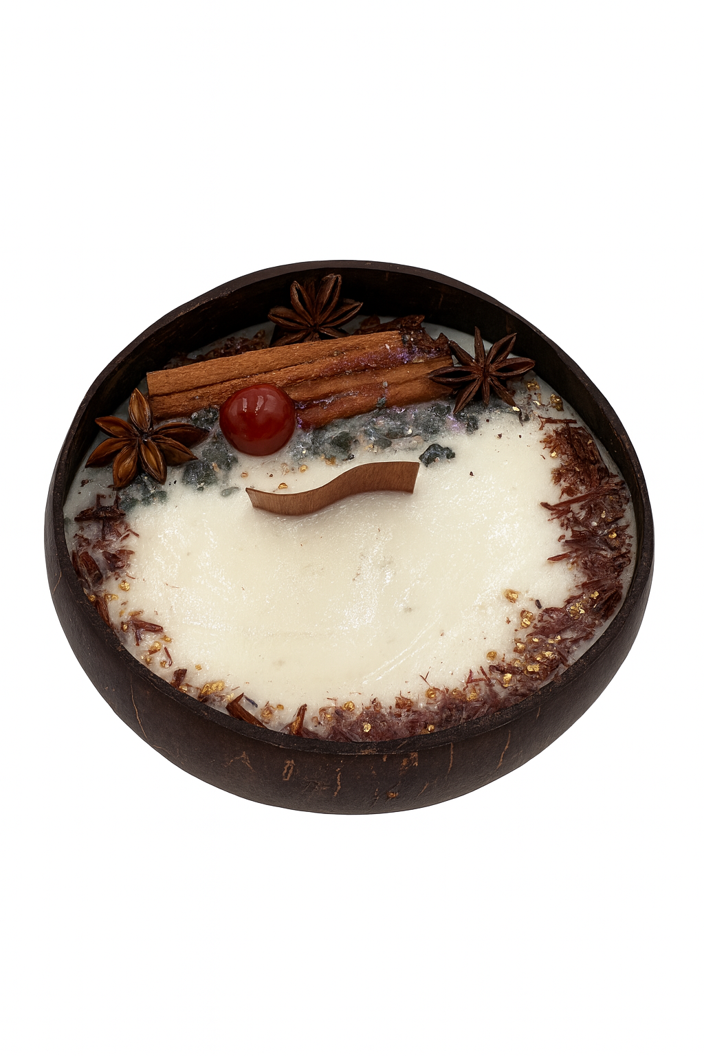 Met zorg gegoten in een natuurlijke kokosnootkom en verfijnd met echte botanische decoraties, is deze kaars een waar stukje ambacht.